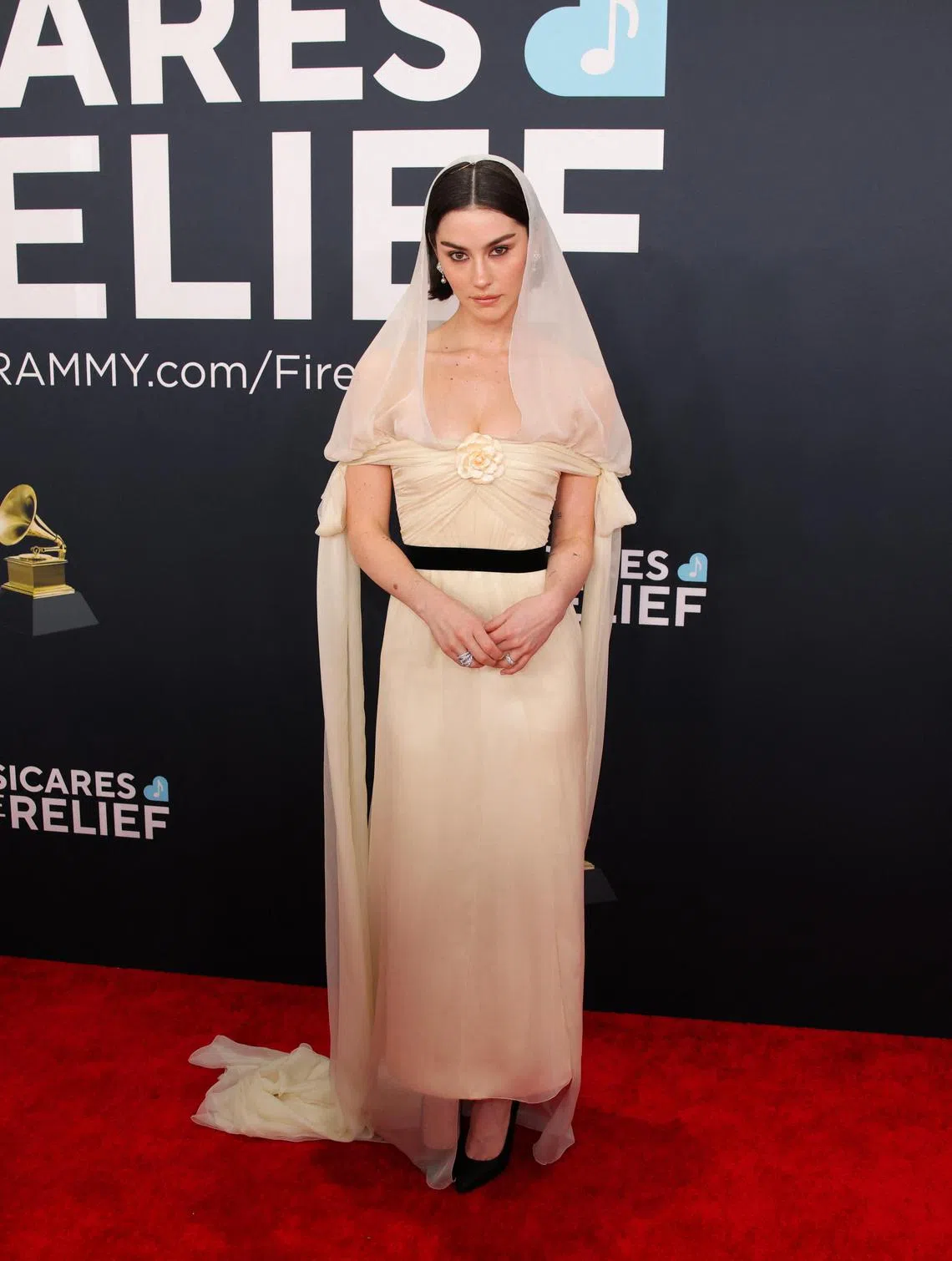 Here comes Gracie Abrams, who floats onto the red carpet looking like a runaway bride. Draped in an ivory chiffon gown by Chanel complete with veil, the rising American singer radiates Main Character Energy – no groom required – with an off-the-shoulder neckline and the fashion house’s signature camellia detail.