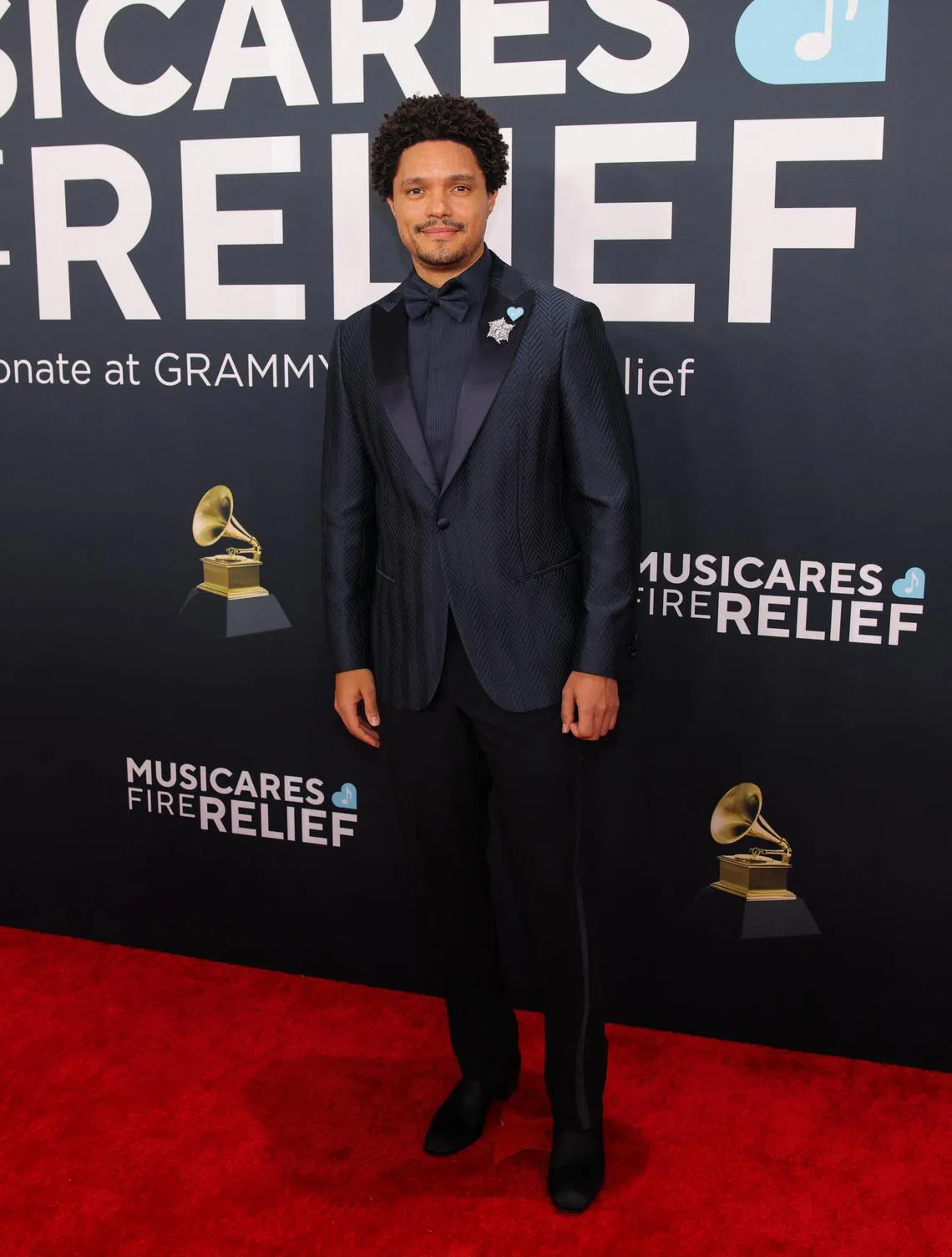 Returning as host for the fifth consecutive year, South African comedian-presenter Trevor Noah set the gold standard for red-carpet dressing. Looking effortlessly sharp, he commanded the evening in a midnight-blue Giorgio Armani evening jacket, woven with a subtle chevron tone-on-tone pattern.