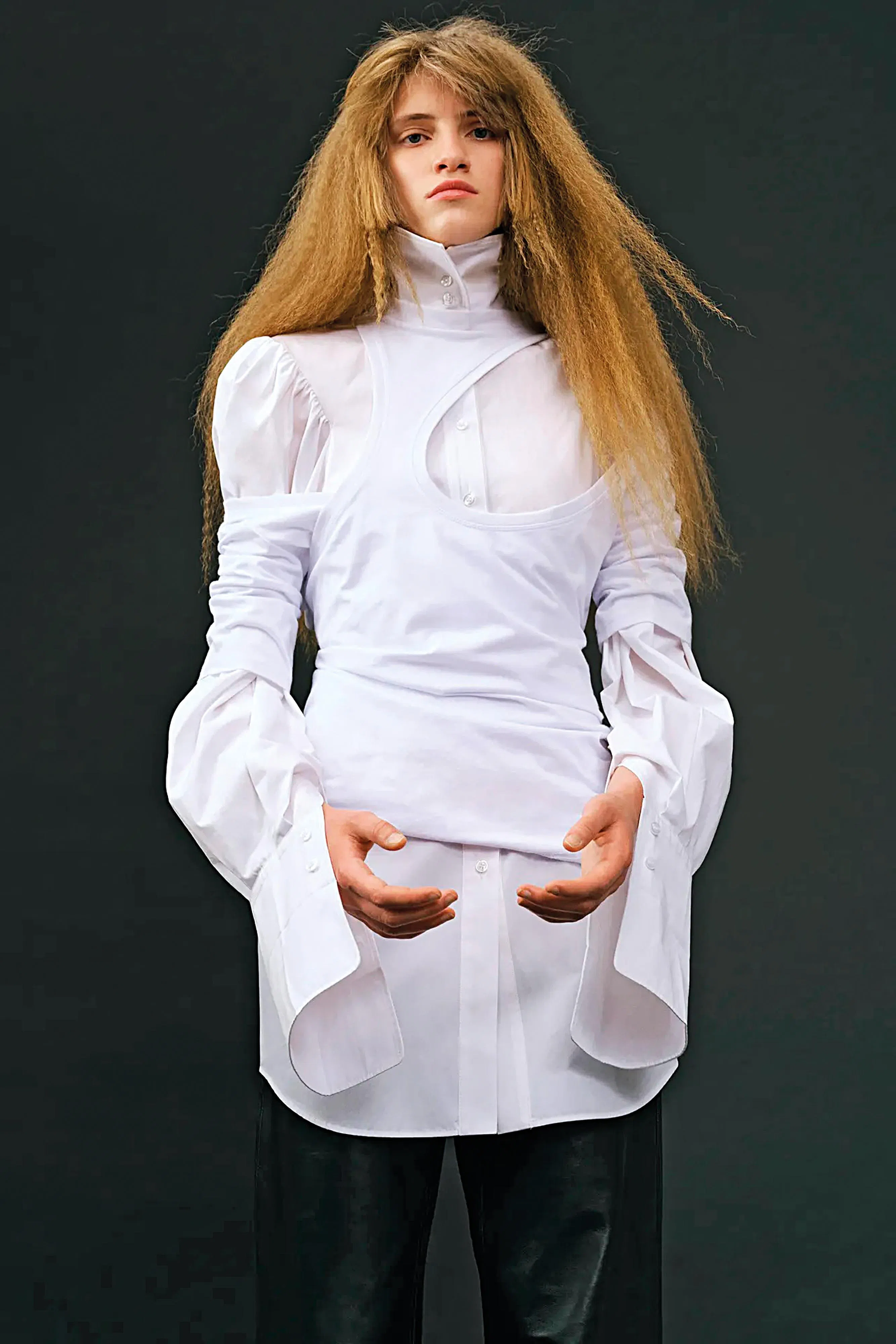 And what a slew of options awaits. American designer Christopher John Rogers’ extra-long shirt features exaggerated collars while Italian brand Sportmax has elongated its shirt sleeves, raised the collar and layered a cut-out T-shirt on top.