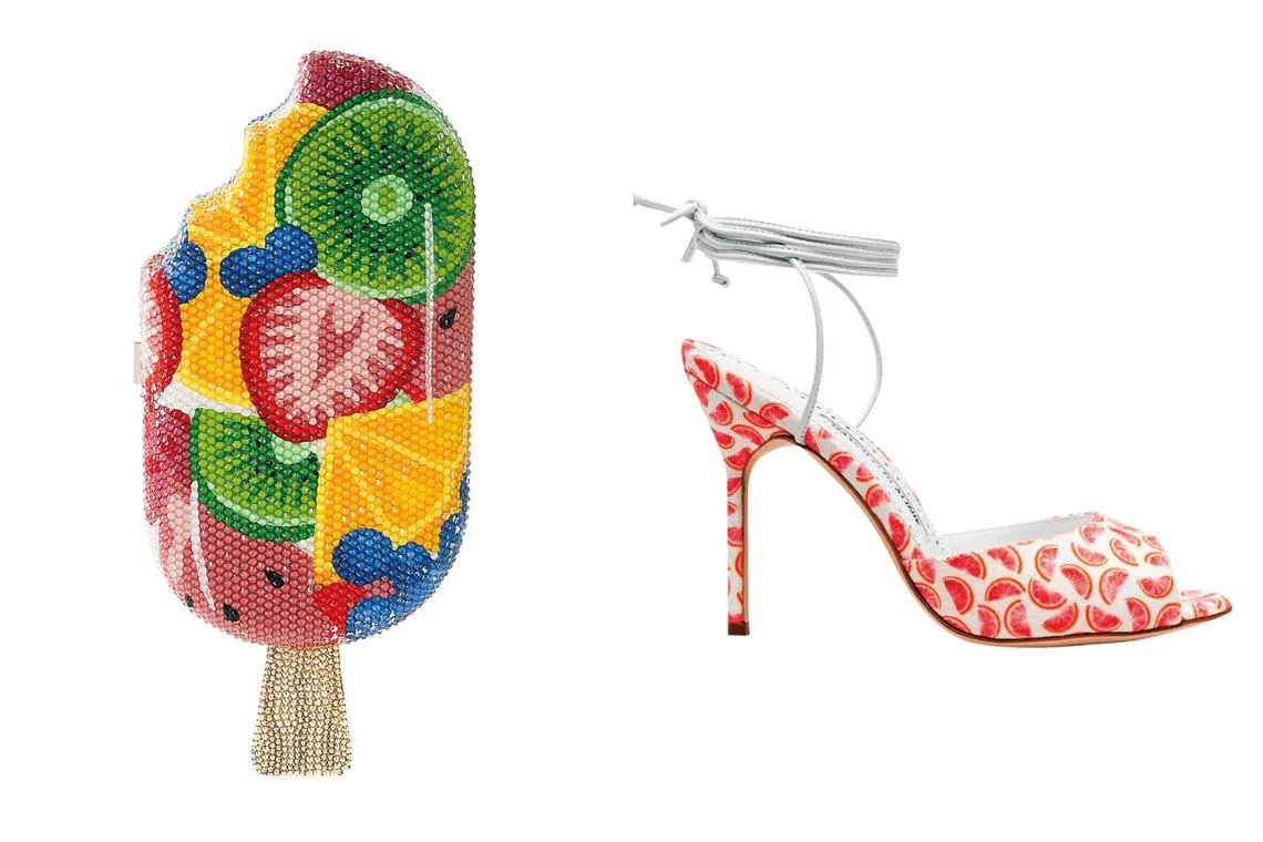 A Judith Leiber clutch (left) and a fruit-printed Manolo Blahnik.