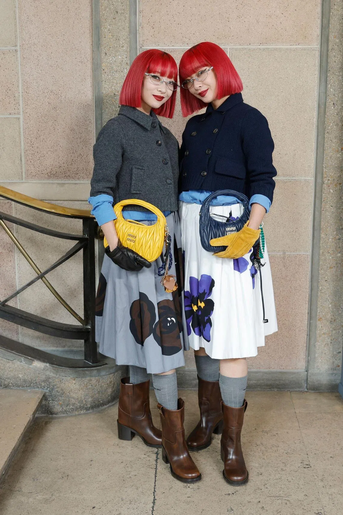 Twin sisters Ami and Aya Suzuki, of Japanese music duo Amiaya, arrive at Miu Miu’s show for its Women Ready-to-wear Spring-Summer 2025 collection at Paris Fashion Week in October.