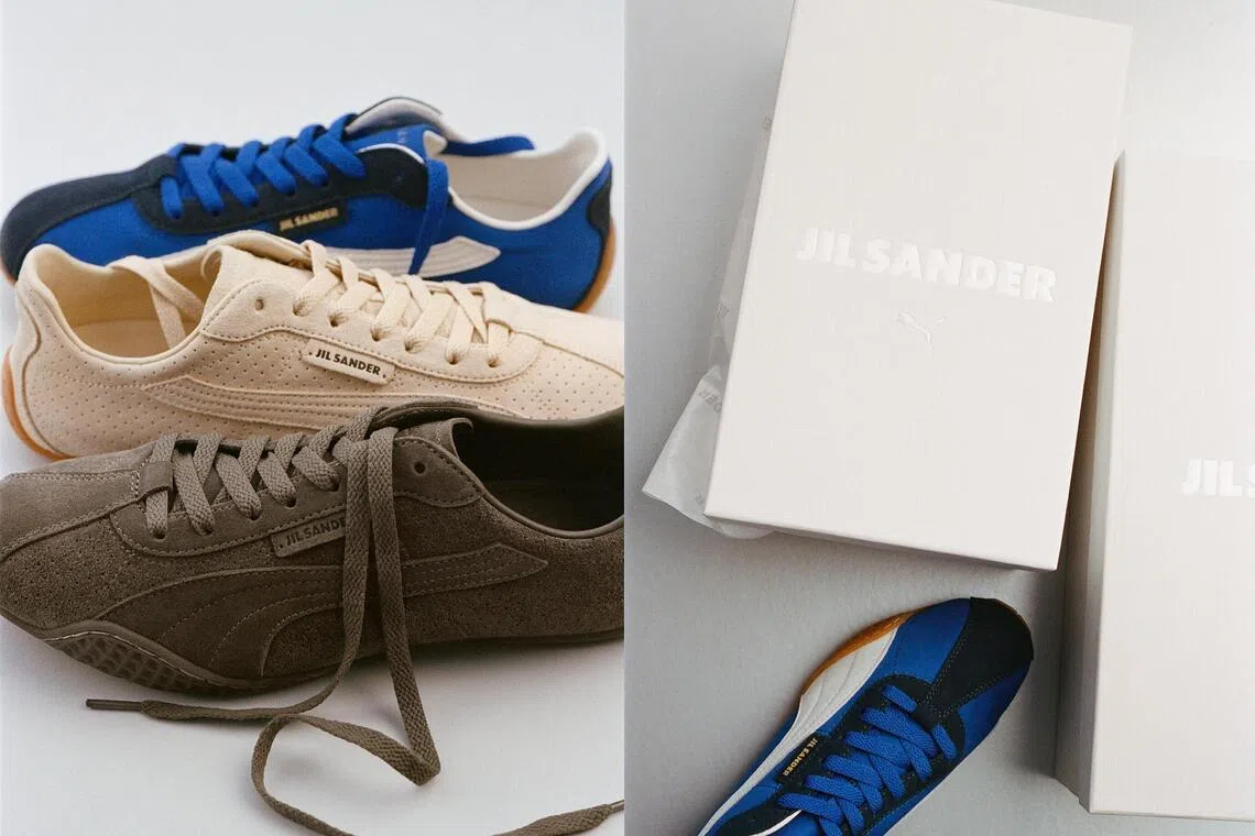 The unisex sneaker ($599) is offered in three finishes: perforated suede in matt bronze, beige canvas, and electric blue with contrast suede detailing. Co-branded elements are kept minimal, with Jil Sander lettering and Puma’s leaping cat logo placed subtly on the shoe.