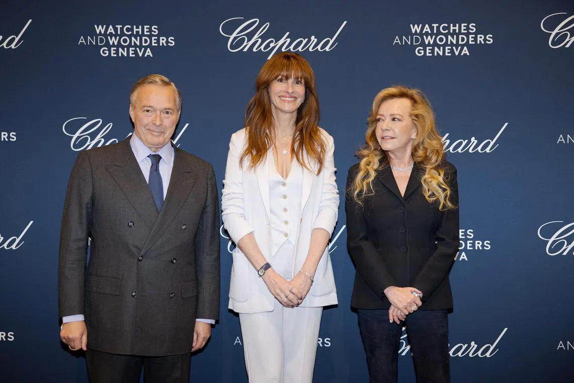 (From left) Chopard CEO Karl-Friedrich Scheufele, US actress Julia Roberts and Chopard president Caroline Scheufele at Watches & Wonders 2023.