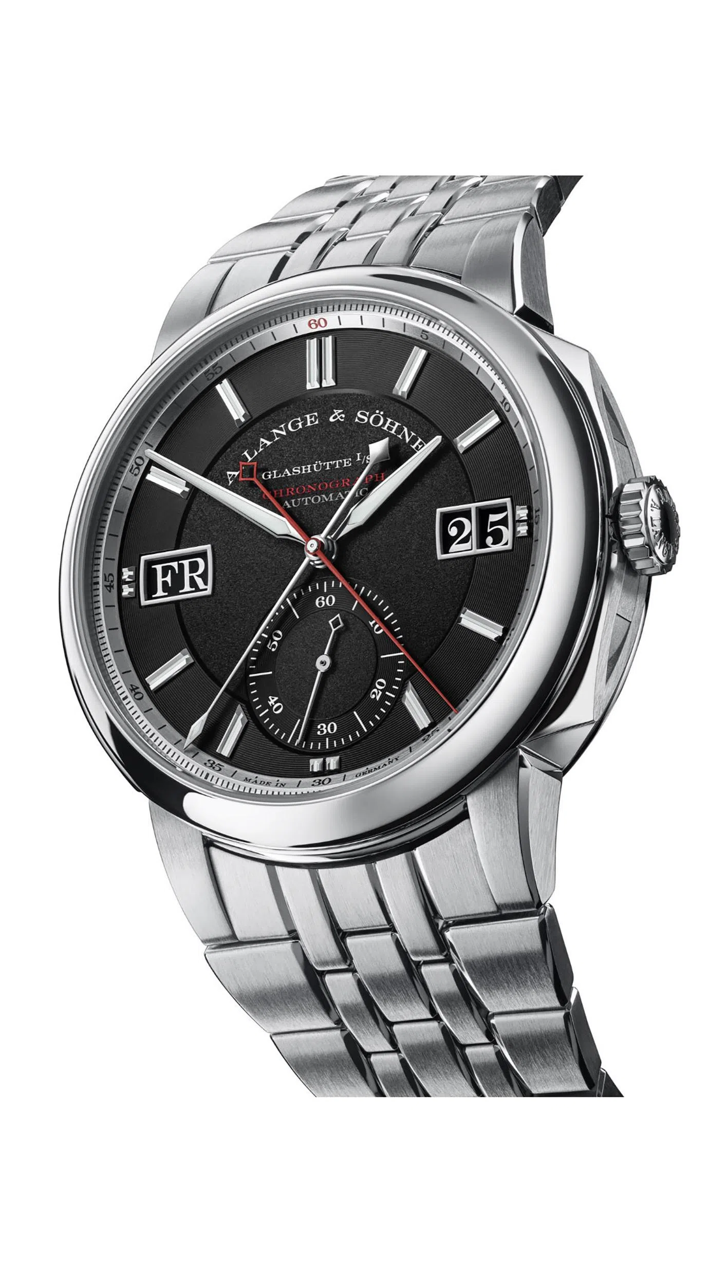 The Teutonic handsomeness of A. Lange & Sohne’s famous dial design is evident here. Both chrono counters have been placed in the middle of the dial, allowing the brand’s iconic outsized day and date displays to be at 3 and 9 o’clock.