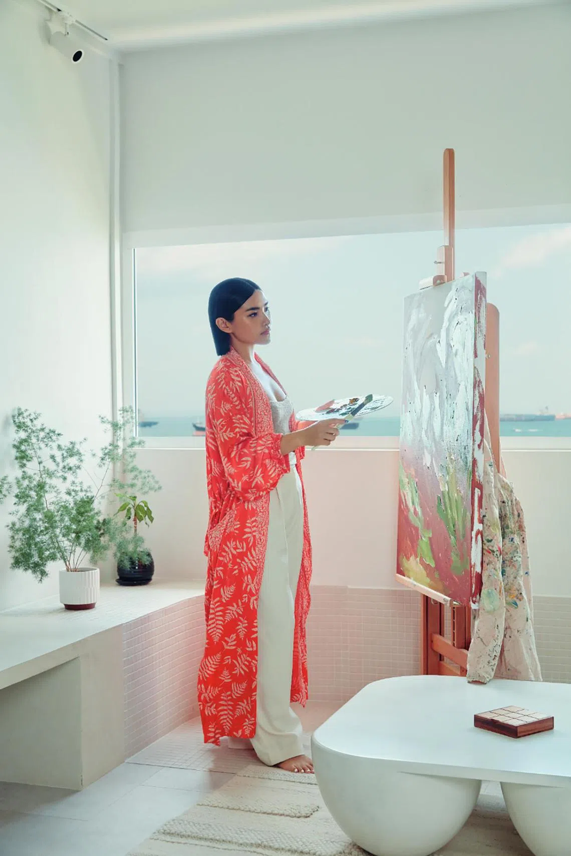 Artist Sophie Mong wears a Zara kimono top in the living room of her apartment as she works on a painting.