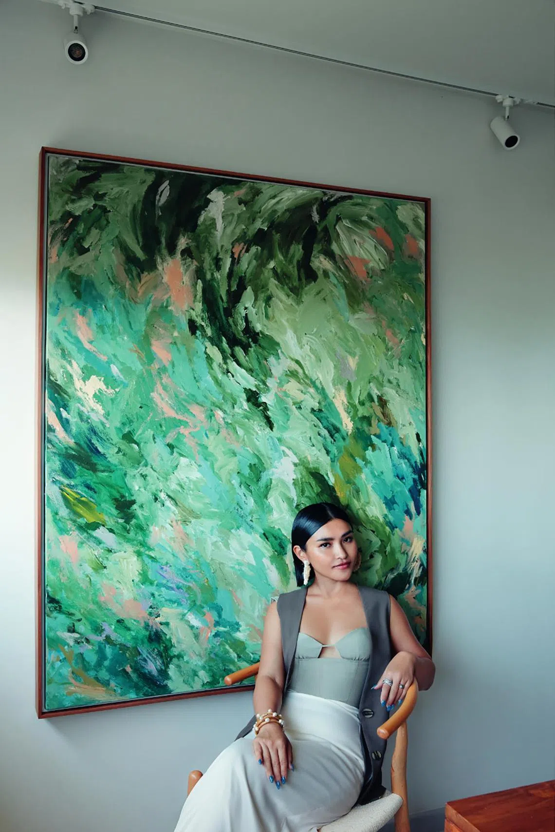 Artist Sophie Mong in her home and wearing a Mango jumpsuit, Hermes bangle, Calla Lily ring, Zara sandals and her own earrings.