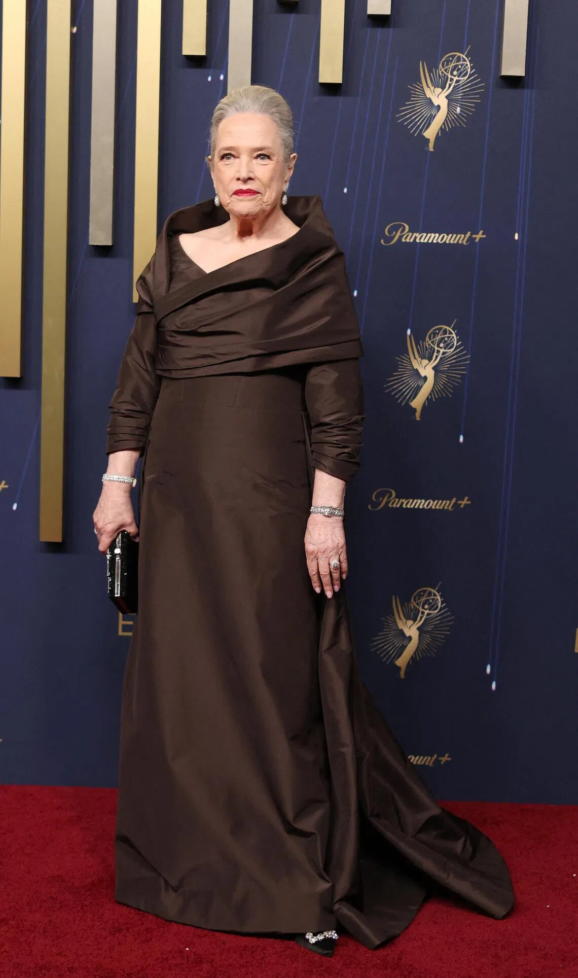 Oscar-winning American actress Kathy Bates – one of the rare nominees from a broadcast network show, for best actress in a drama for CBS’ reboot of legal drama Matlock (2024 to present) – looked regal in a floor-length brown gown with long sleeves and a draped bodice.