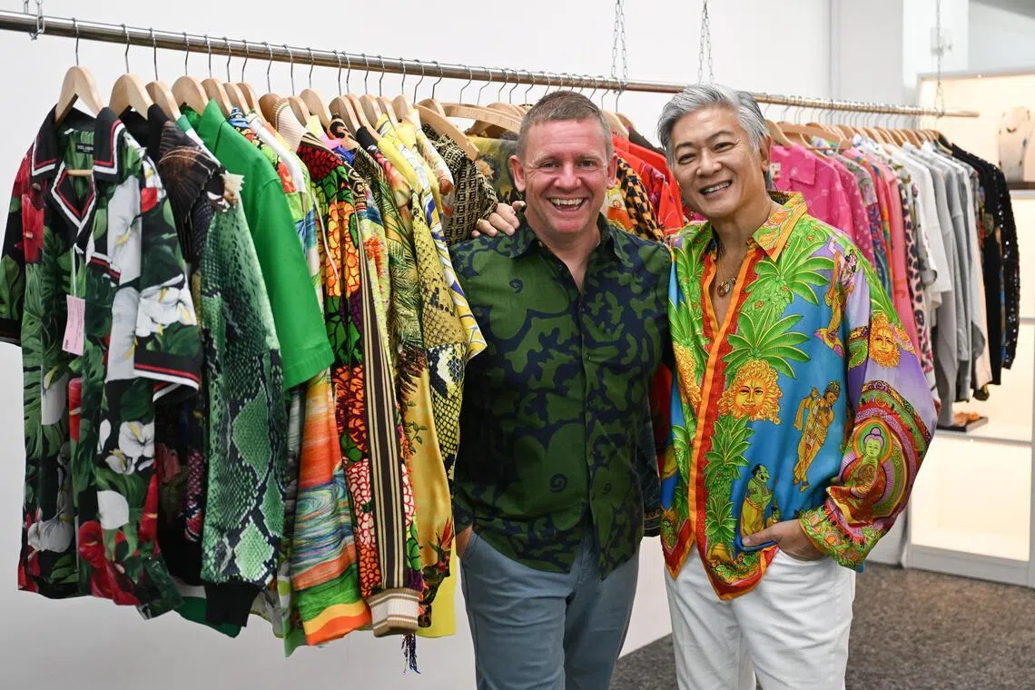 Dick Lee (right) with Mr Matthew Elton, founder of Singapore-based auction house Hotlotz, which is auctioning off a part of Lee’s extensive wardrobe.