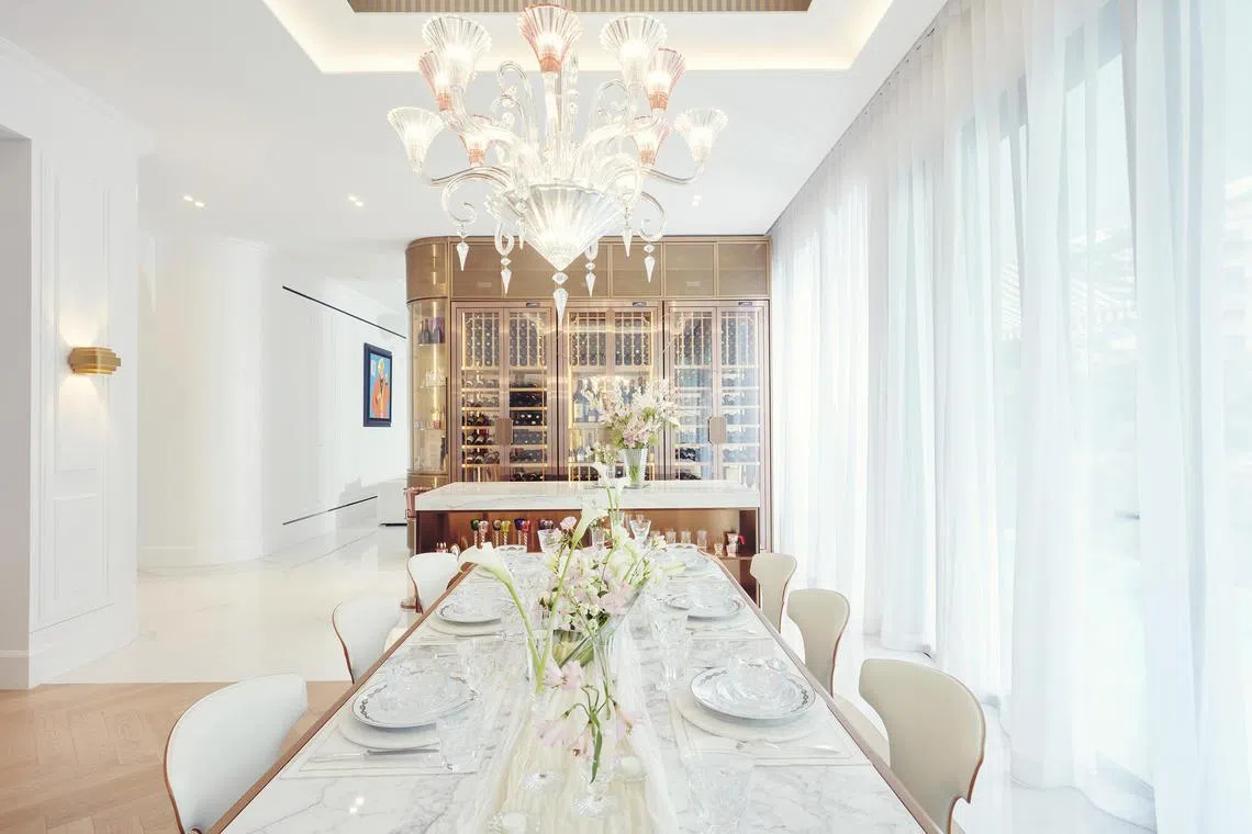 Adjacent to the eight-seater Giorgetti dining table set that is anchored by a Baccarat crystal chandelier hanging above, a wine chiller flaunts an impressive selection of vintages, including revered labels Chateau Mouton Rothschild, Petrus and Chateau Margaux.