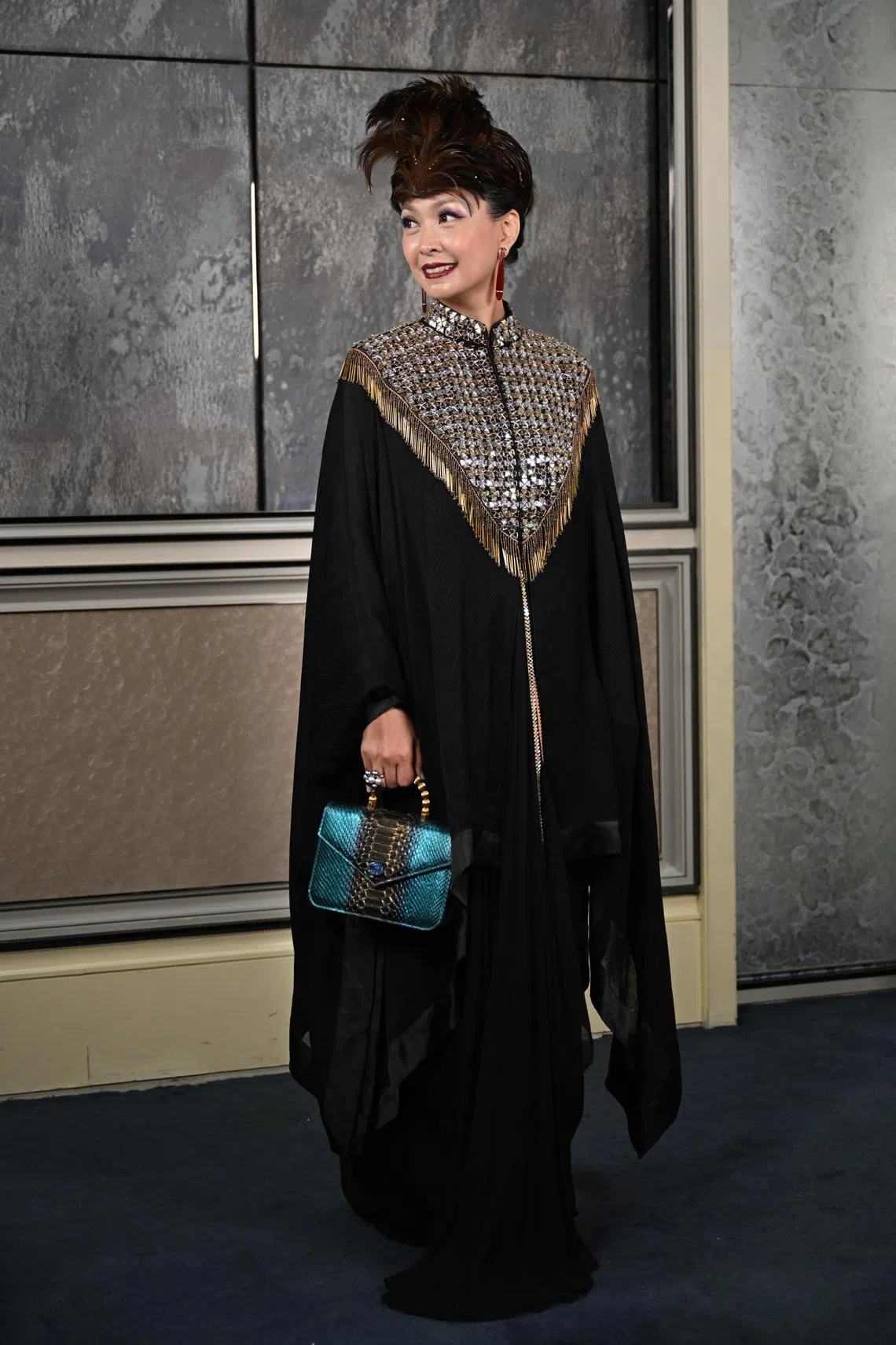 Ng wore an embellished tuxedo suit by Versace, paired with a custom feather arm piece by Frederick Lee Couture and Cartier jewellery.