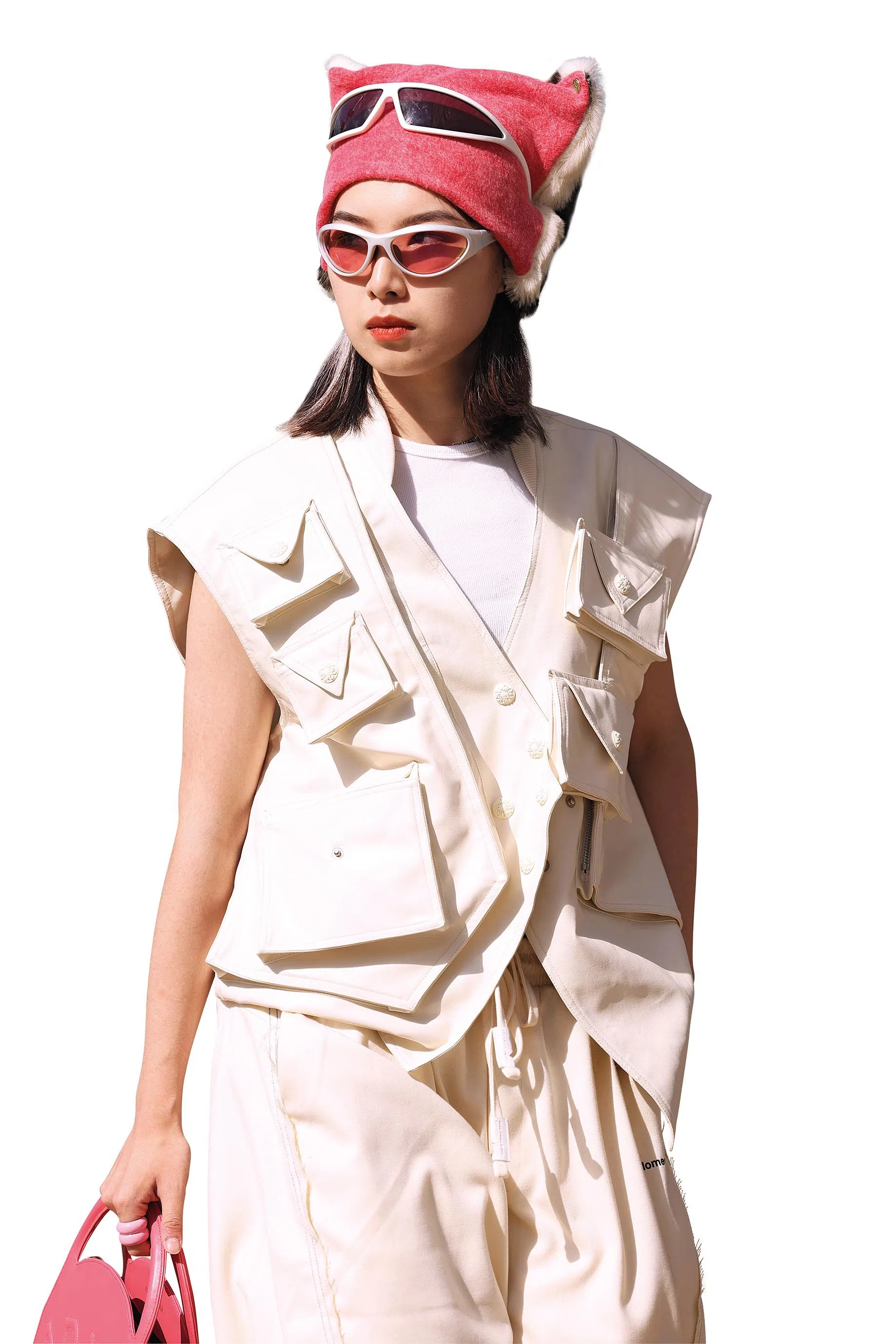 Looking for hair and make-up styling suggestions? Wear your hair down and keep your make-up fresh. Or opt for a cargo vest and matching drawstring trousers, paired with a bag, beanie and lenses in rose-red hues.