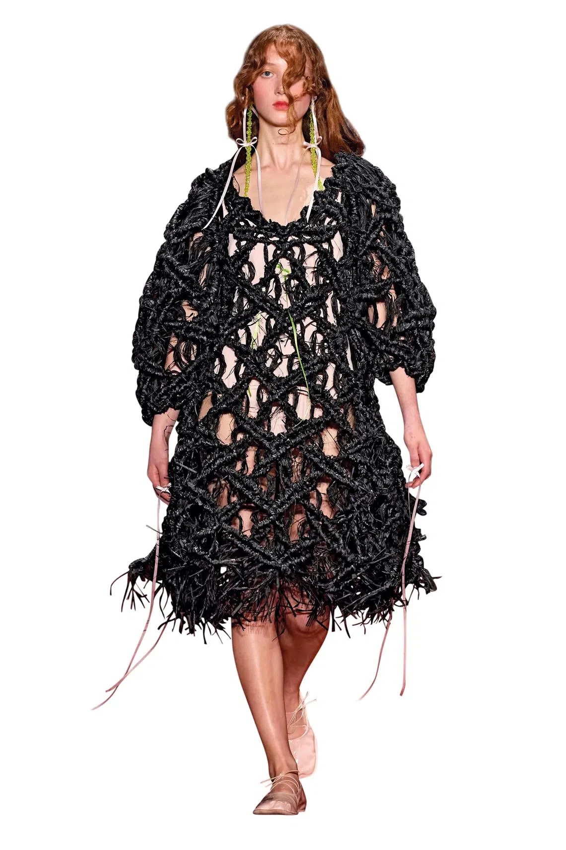Louis Vuitton’s unassuming number is, in fact, made of beaded embroidery and dotted frayed fabric, while Simone Rocha’s harvest-inspired collection had sculptural frocks made from hay-like nylon, creating an alluring visual effect and play on textures.