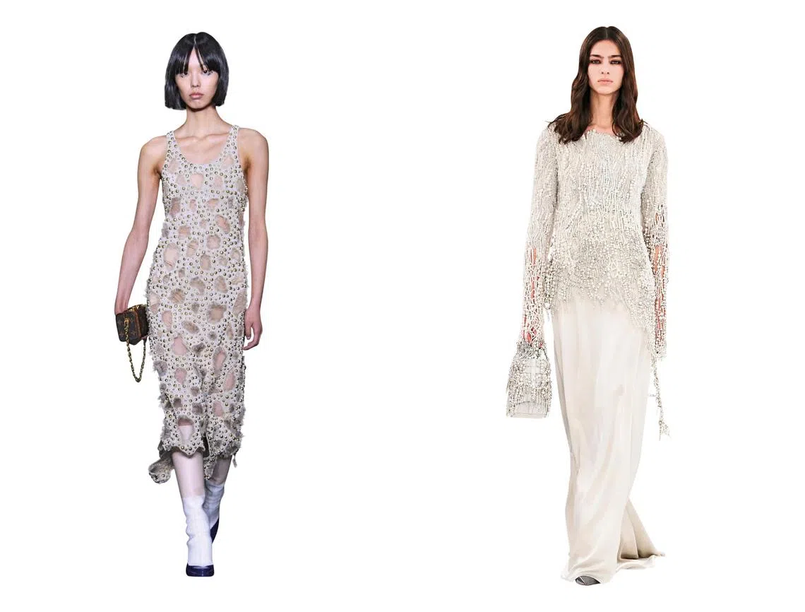 Over at Givenchy, pearls of varying sizes were woven together to create a delicate yet raw top with sleeves and hems trickling down over the hands for an almost mythical allure.