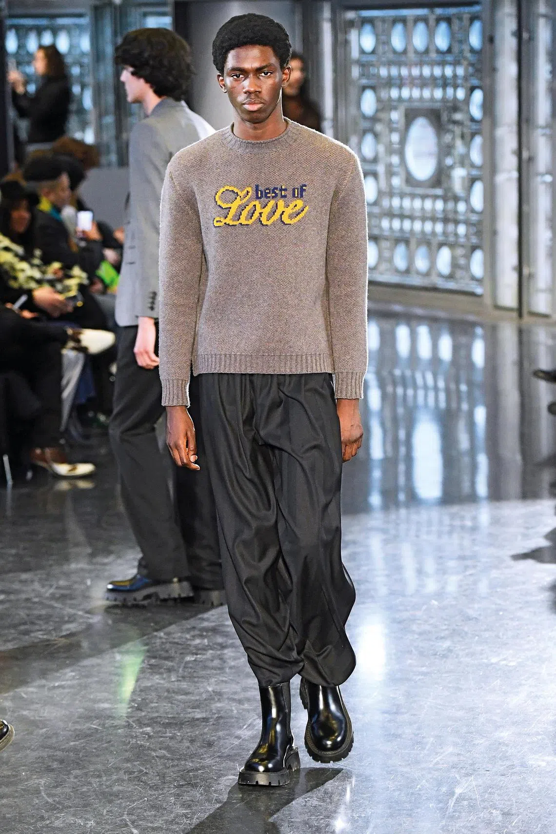 On one model, a snugly fitted knit sweater with the Best Of Love CD logo was a “wink wink” homage to Akyol’s own personal history and will certainly appeal to millennials who grew up with those CDs in their bedrooms.