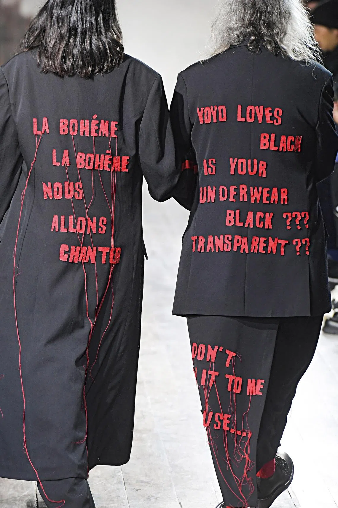 Yohji Yamamoto adorned his signature deconstructed silhouettes with off-kilter sayings such as “YoYo loves black. Is your underwear black? Is it transparent?”