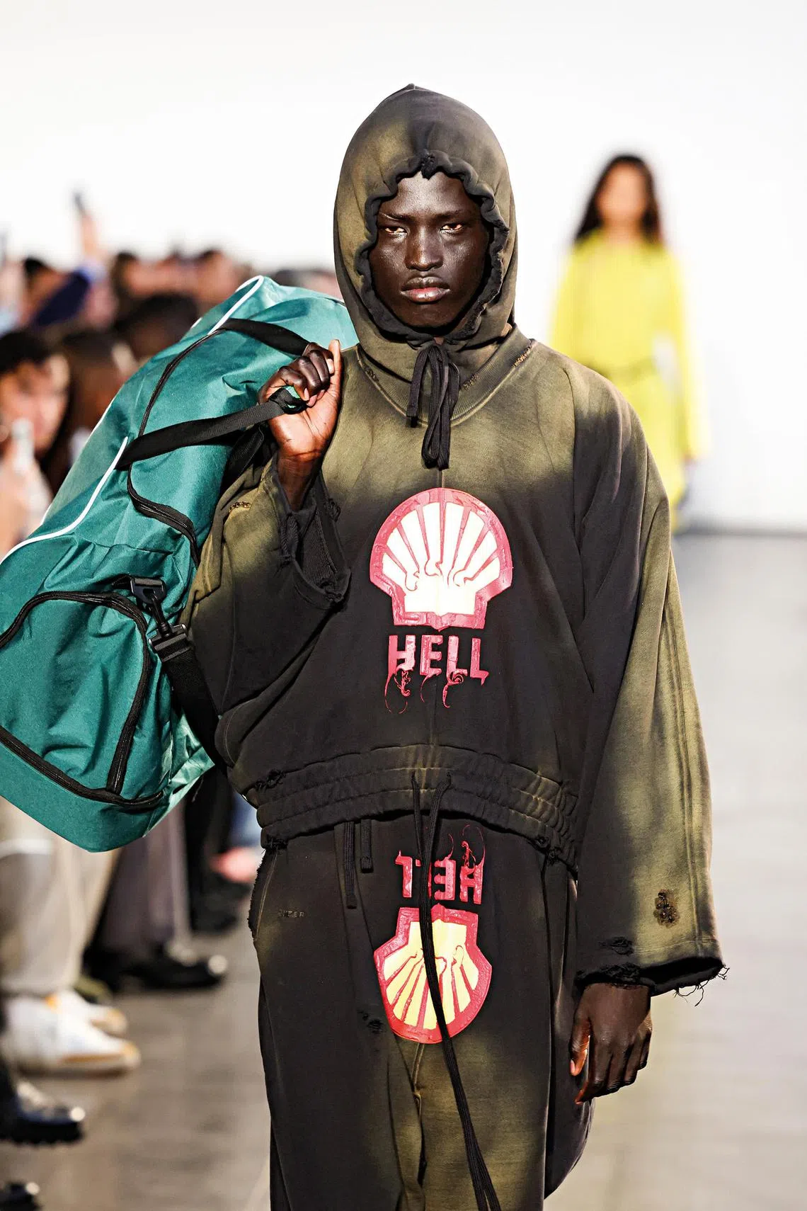Herrebrugh and Botter, who often address social issues through their collections that include ocean pollution and melting icebergs in the past, took aim at Big Oil this time by reimagining a recognisable petrochemical logo that now reads “Hell”.