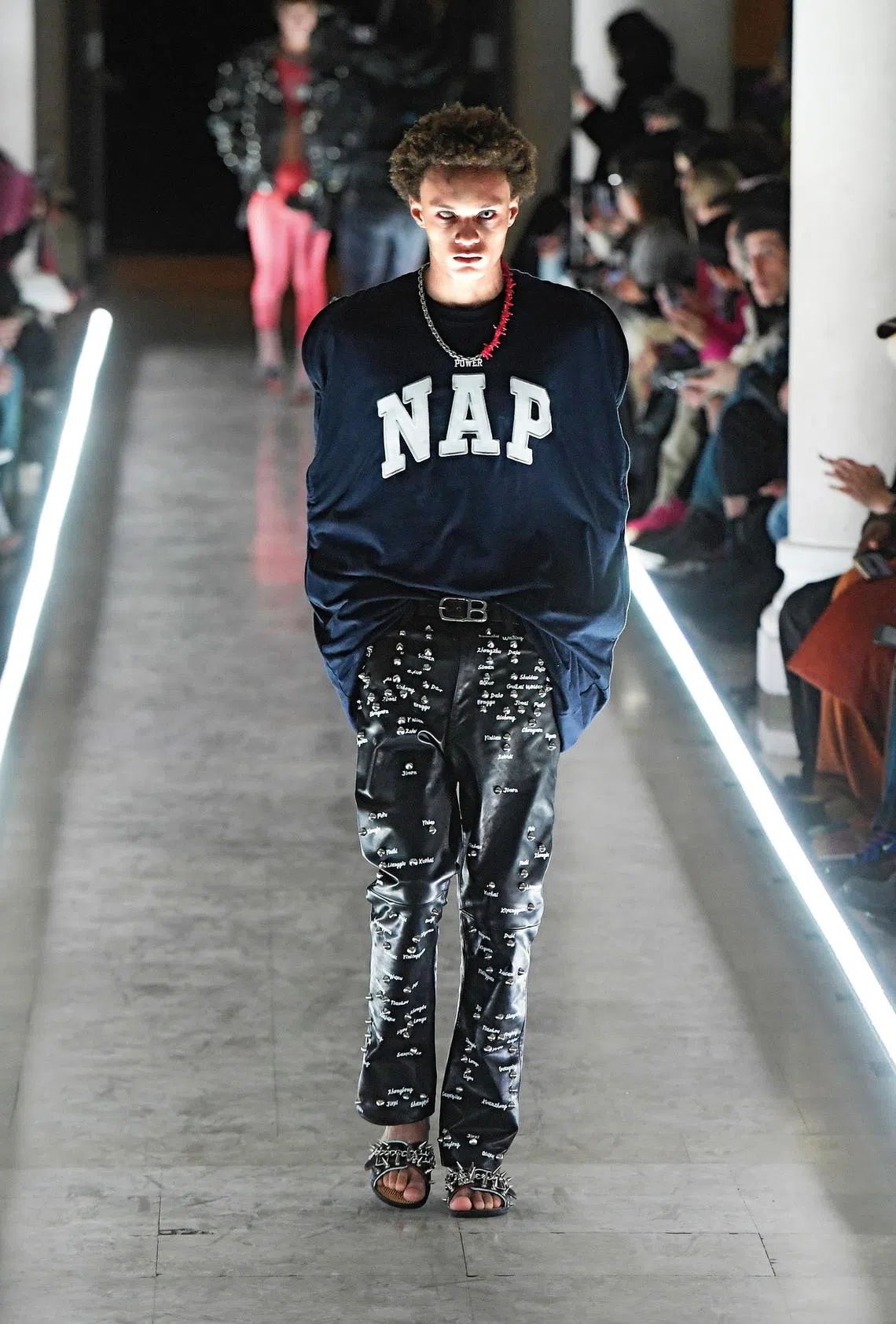 Cue a procession of zombie-walking models that exited onto the runway in knits bearing the word NAP in bold, collegiate font across restrictive knit tops and oversized blanket-shaped hoodies – as if to remind people that no matter how many new sleep techniques they try, they are all tired and frazzled.