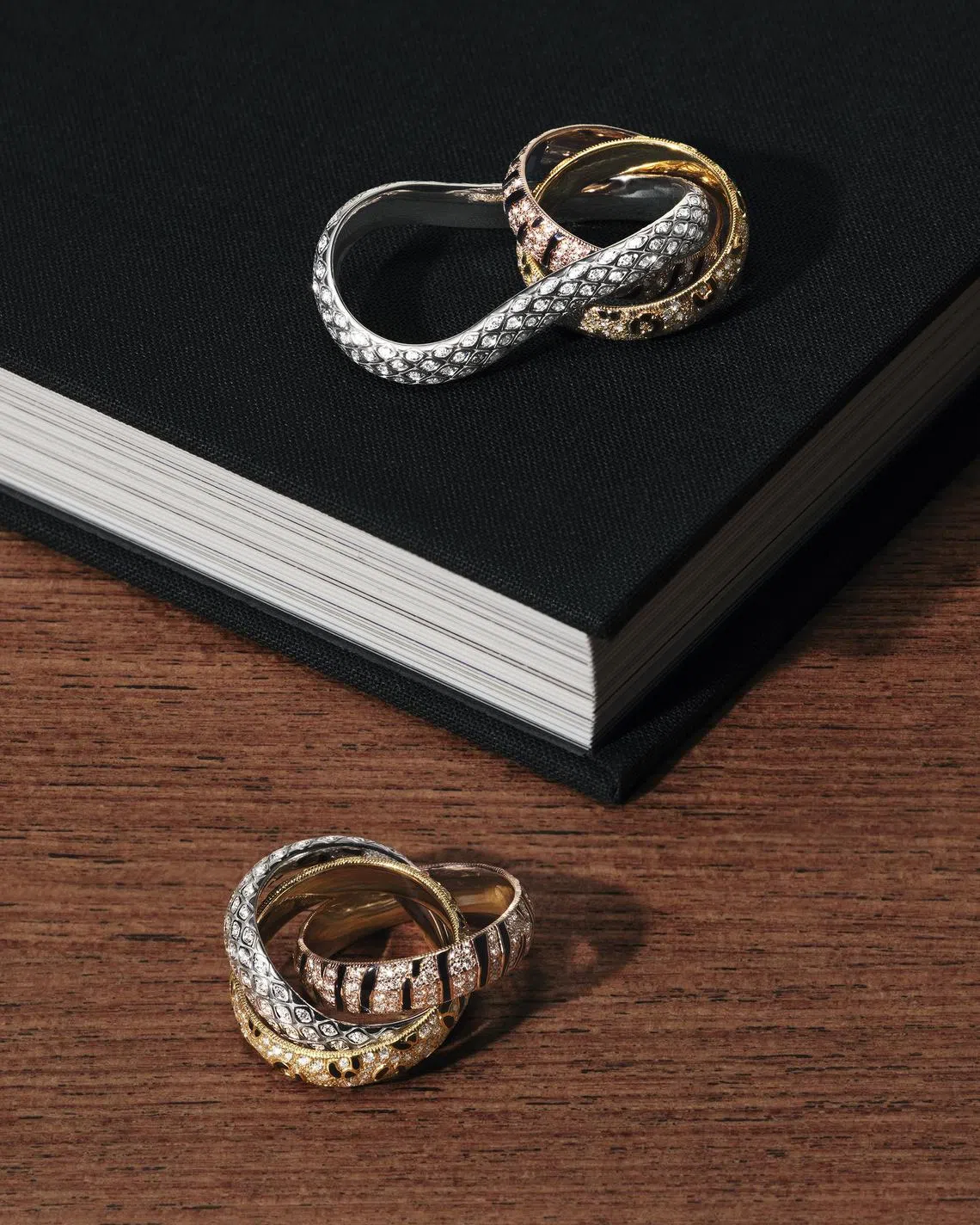 Their motifs adorn each of the ring’s bands: reptile scales for the white gold, and panther spots or tiger stripes in black lacquer for the yellow and rose gold. Each ring’s shape is different too – rippled for the snake, pyramidal for the tiger and rounded for the panther.