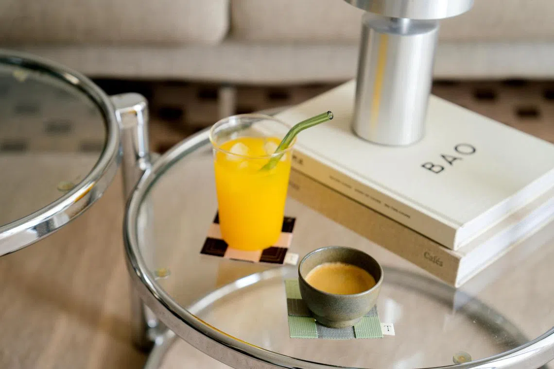 There are the Kueh/Kueh Coasters in Onde Onde, Sago, Kosui, Lapis, Dadar ($12 each); Barista Cloths ($25) in interlocking colour blocks, which are the studio’s first print product; and an Affogato Set ($58) that pairs a stainless steel bowl with a hand-beaded placemat, inspired by the beaded wooden seat covers regularly seen in taxis.