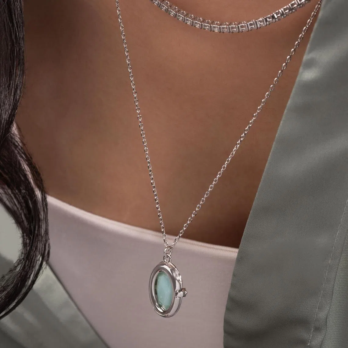 Wanderlust + Co’s Aura Amazonite In Silver Locket Necklace.