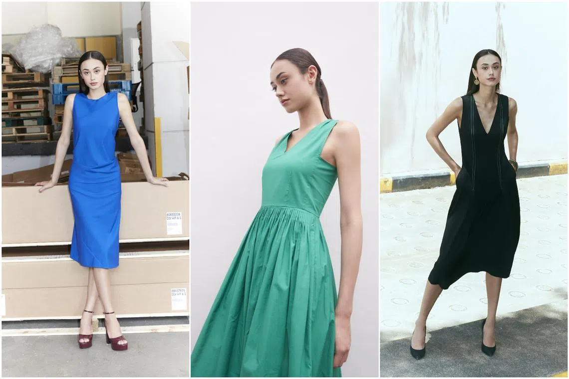 (From left) Akinn Sofia single-seam sheath dress, Akinn Sara V-Neck Fit & Flare Micro Pleated Dress and Akinn City Layers collection – Andi Deep V-Neck Fit & Flare Dress.