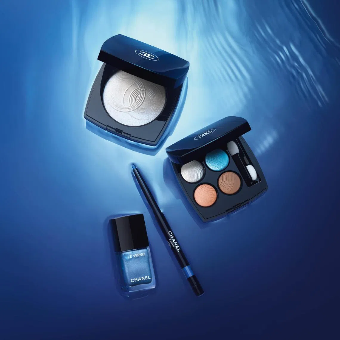 Inspired by the ocean, she chose chromatic blue for the main palette – reflected in the Les 4 Ombres Rivage eyeshadow quad ($116), with a satiny turquoise shade and embossed with curved ridges resembling ripples on water; Bleu Abysse Stylo Yeux Waterproof ($43), an electric blue eyeliner; and Lagune nail polish ($46).