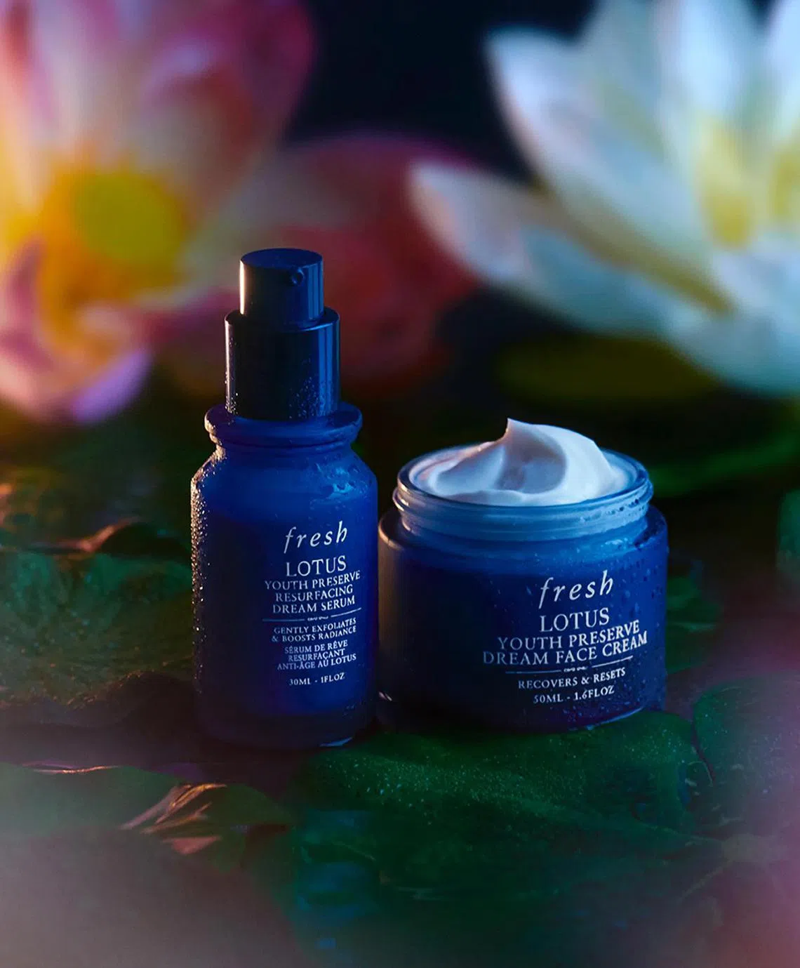 Fresh’s Lotus Youth Preserve Resurfacing Dream Serum and Lotus Youth Preserve Dream Face Cream.