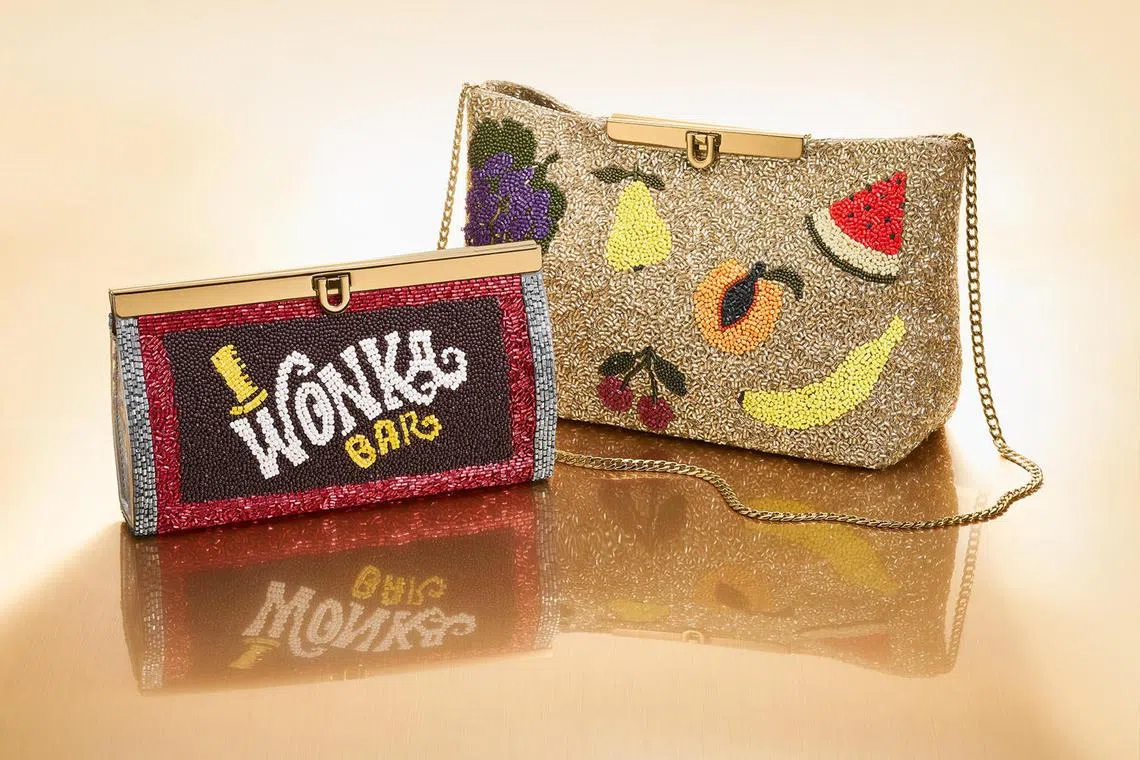 The collection is every bit as whimsical as one would expect. The stars of the collab are two intricate, hand-beaded bags – a scrumptious chocolate bar clutch ($449) and a fruit-adorned bag ($499) paying tribute to Willy Wonka’s lickable wallpaper.