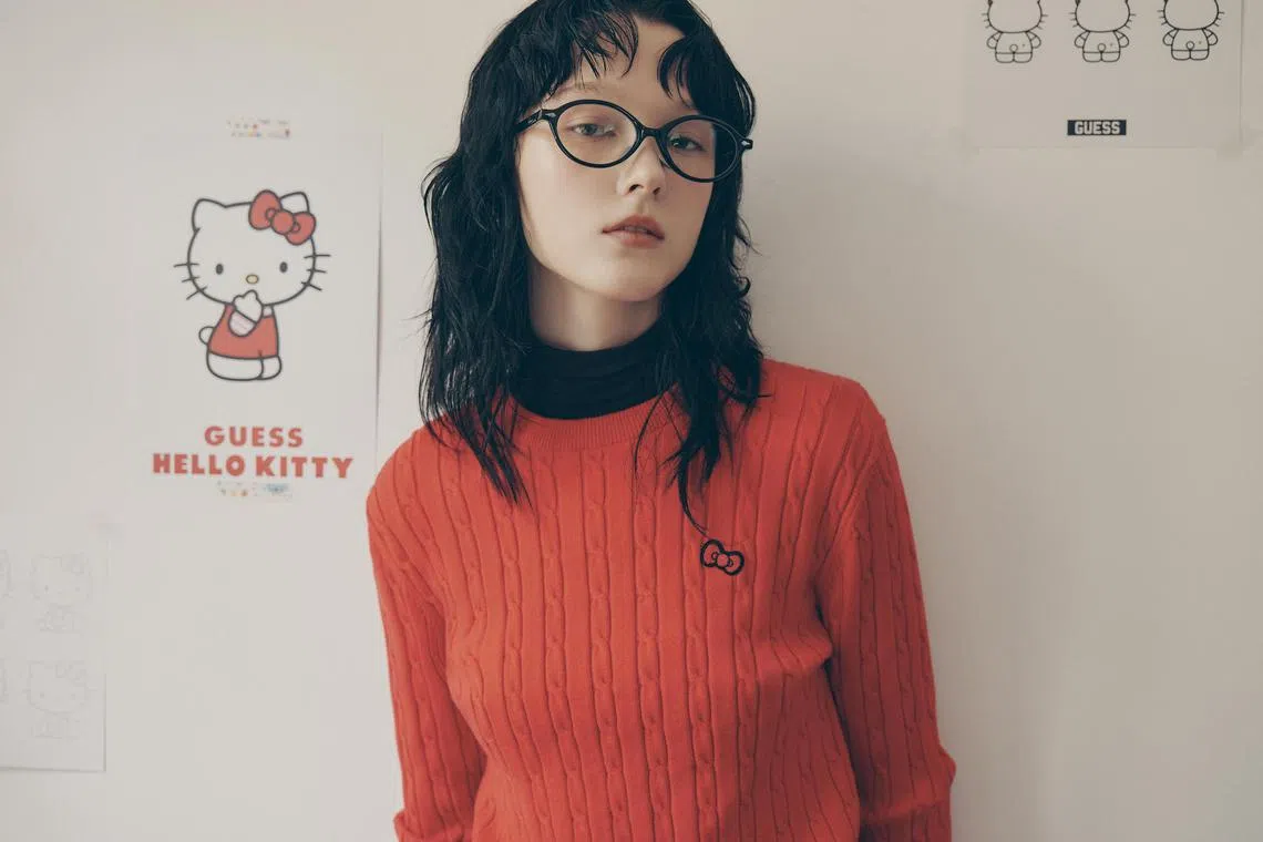 Guess x Hello Kitty limited-edition sweater with Hello Kitty’s iconic ribbon details.