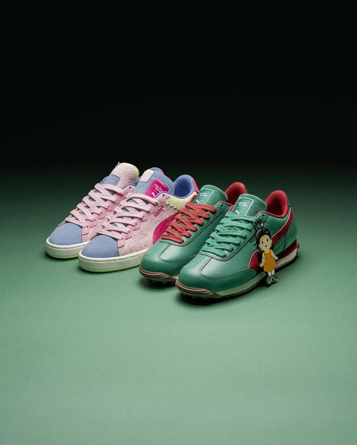 The Puma x Netflix Squid Game collection features the iconic green and white tracksuit, footwear and accessories.