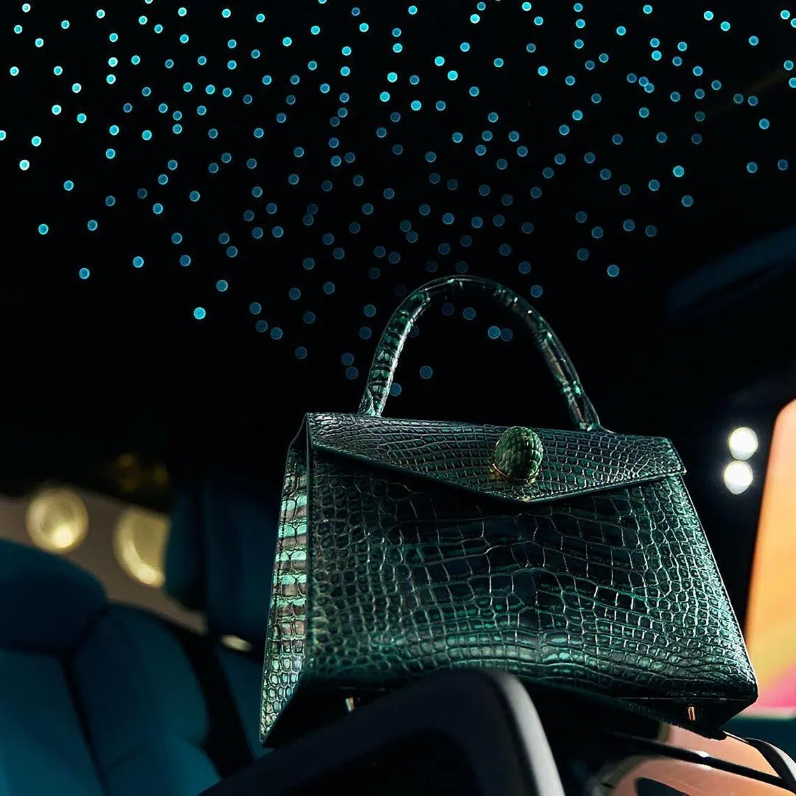 And the iridescent finish of Ethan K’s new hand-painted metallic alligator skin Alla Bag ($38,800) mirrors the starry-night-sky feel of the interior of the Rolls-Royce Phantom in Arctic White.
