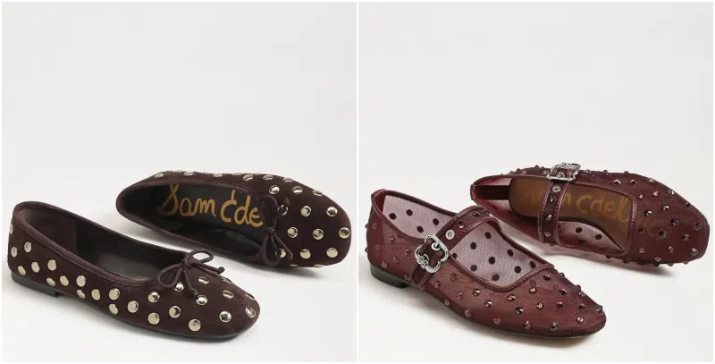 The suede Alie Studded Ballet Flat in Cafe Noir ($249) (left) and the mesh fabric Michaela Shine Mary Jane in French Merlot ($299).