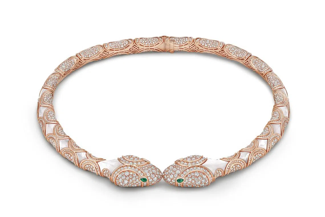 1. The High Jewelry Serpenti necklace in pink gold is encrusted with emeralds and diamonds.