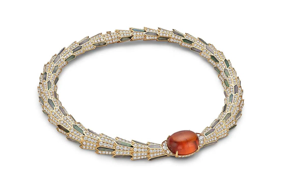 2. The High Jewelry Serpenti necklace in yellow gold features mother of pearl, an oval cabochon mandarin garnet and diamonds.