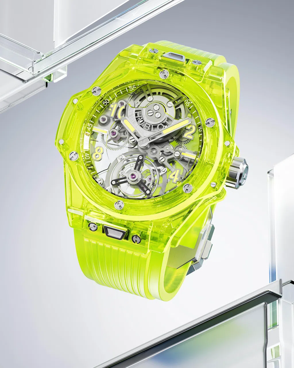 Hublot has always gone the extra mile when experimenting with new materials, and this time, it has decided to wow the horological fraternity with the Big Bang Tourbillon Automatic Saxem Yellow Neon.