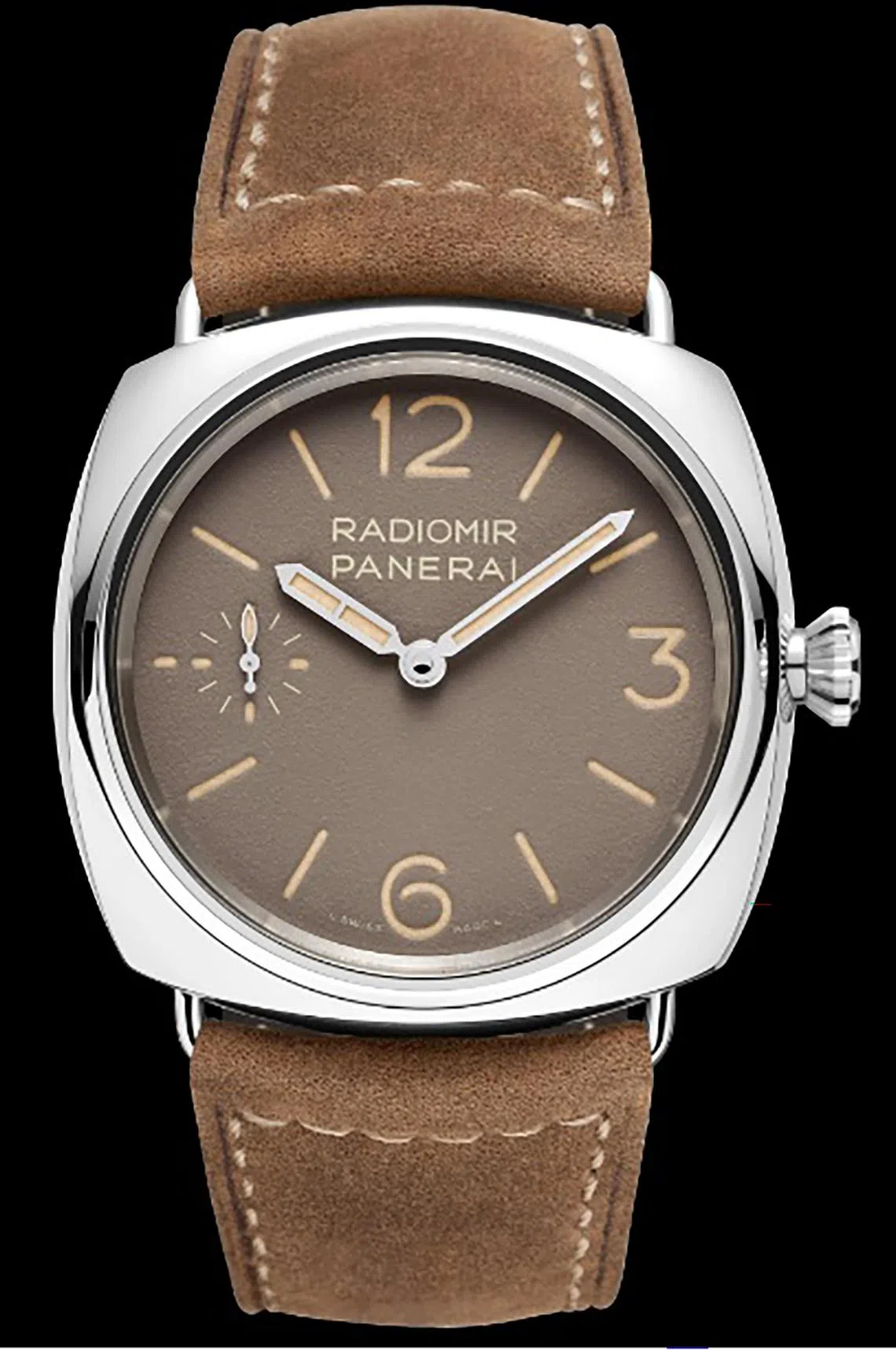 The PAM01385 is fitted with a dark brown Scamosciato calf leather strap with beige topstitching. Limited to 300 pieces.
