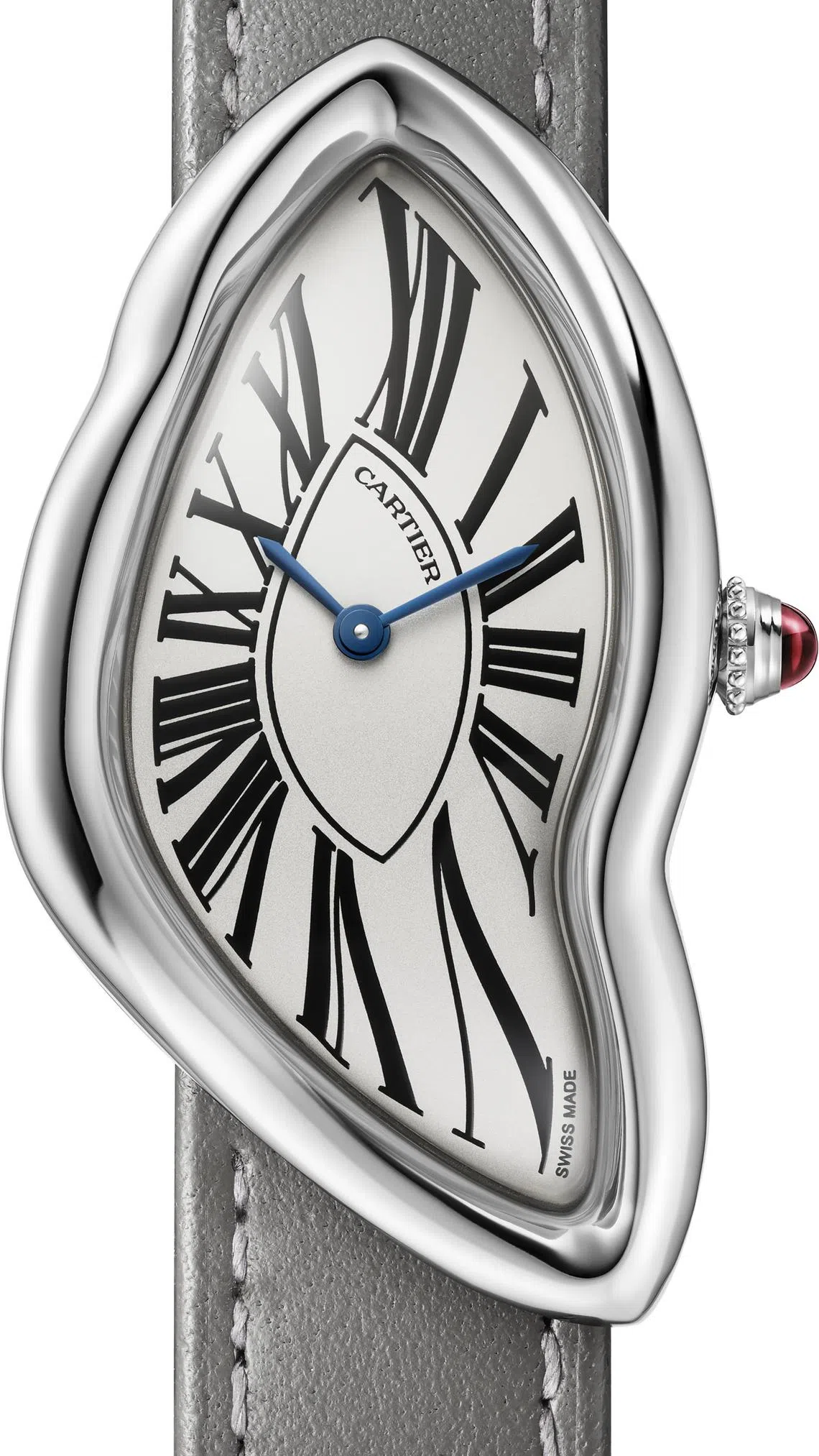 Fans will recognise Cartier’s signature watchmaking codes in the timepiece: Roman numerals, sword-shaped blue-steel hands and a ruby cabochon set in a beaded crown.