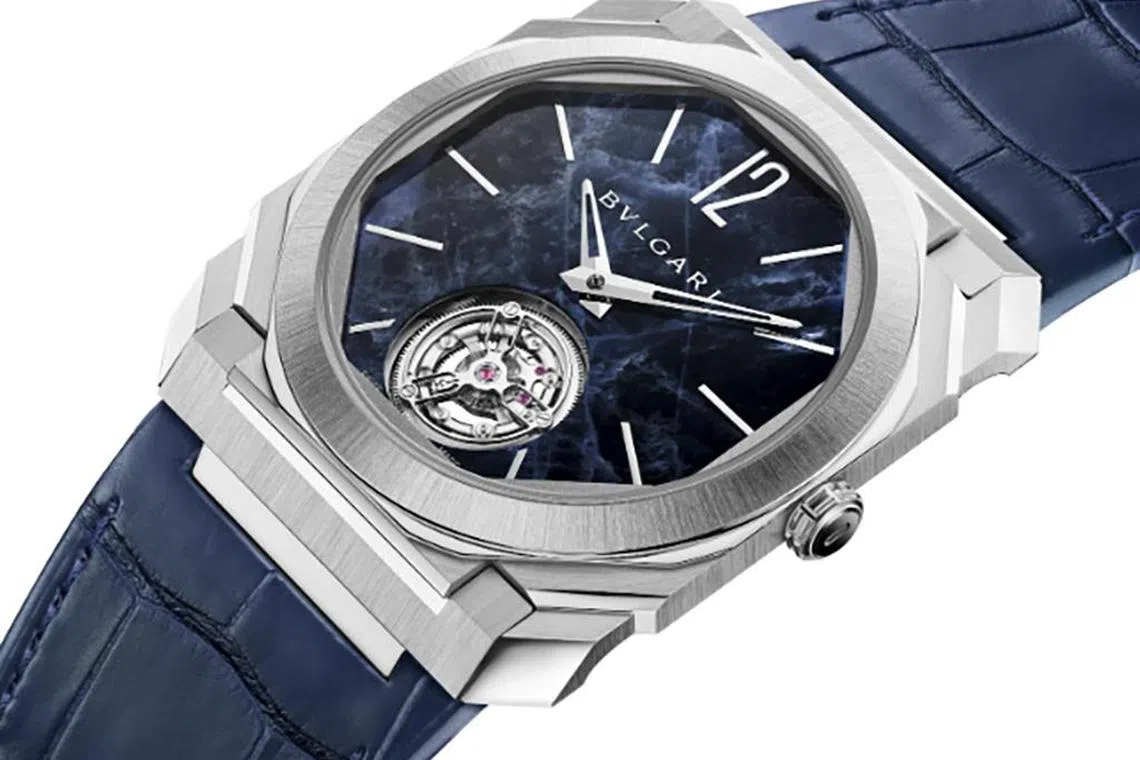 Bvlgari’s Octo Finissimo Tourbillon Marble features a deep-blue Blu Incanto marble dial sourced from Italian quarries.