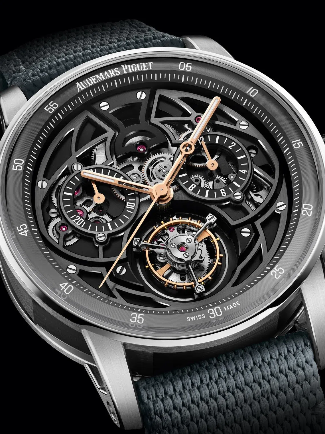 Audemars Piguet has unveiled a sleek grey-toned version of its Selfwinding Flying Tourbillon Chronograph. The 41mm two-tone case features 18K white gold paired with black ceramic, housing the Calibre 2952 self-winding movement, which flaunts a flying tourbillon and a flyback chronograph.