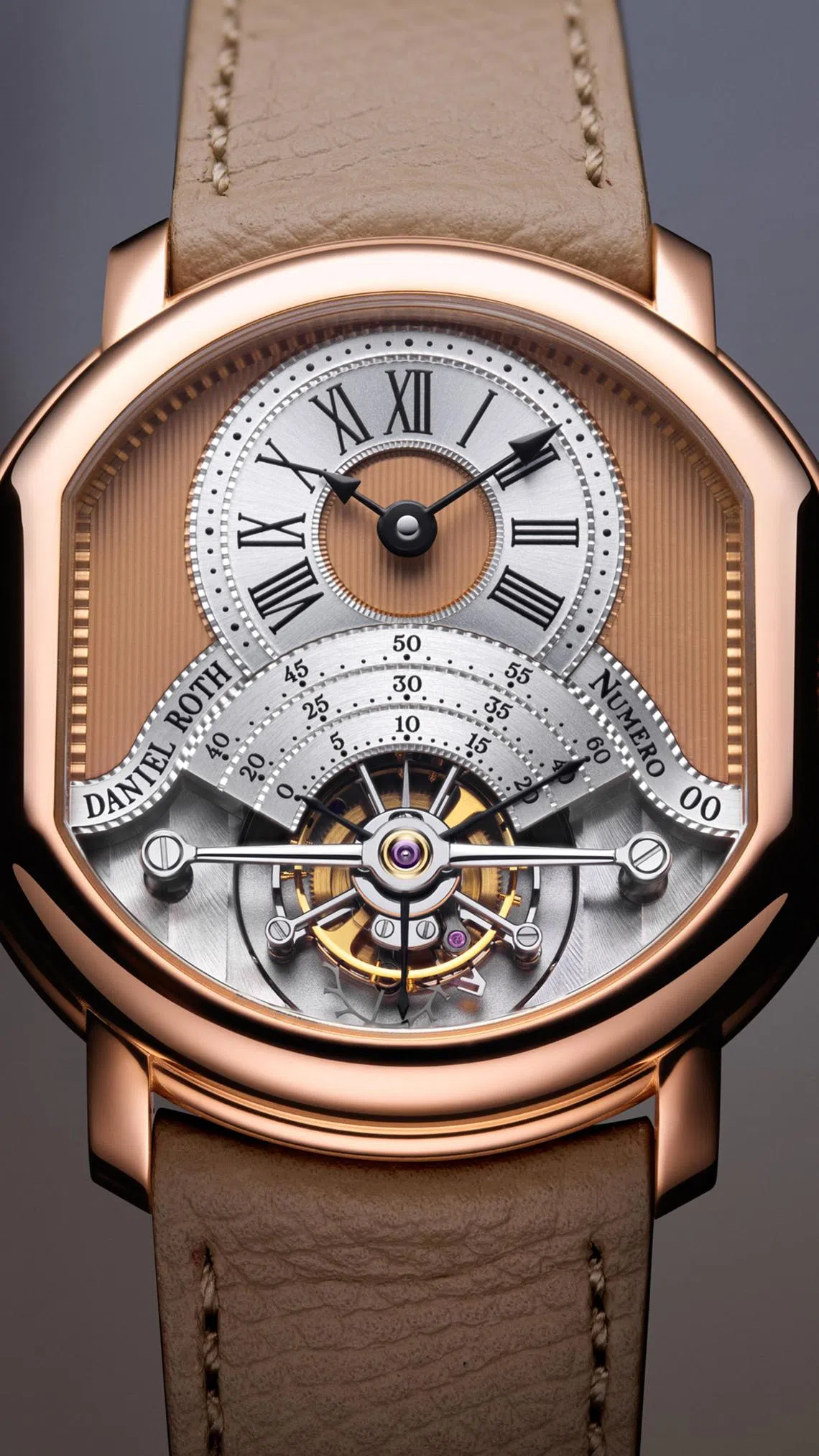 The Daniel Roth Rose Gold Tourbillon Souscription is fashioned from 18K 5N rose gold with a distinctive double ellipse case.
