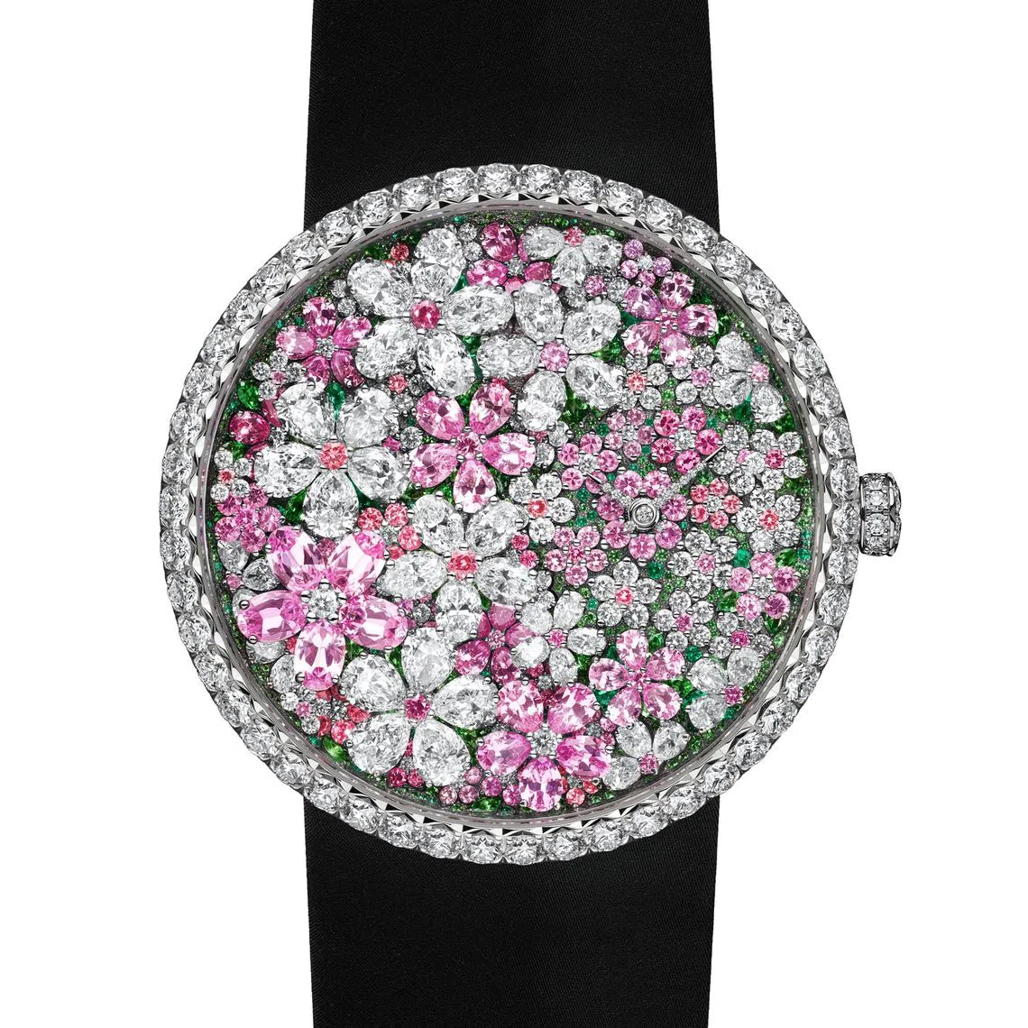 The 38mm white-gold case of the model featured here is a showcase of gem-setting virtuosity, with more than 1,000 stones – including diamonds, pink sapphires, emeralds and garnets – meticulously arranged on the dial to create blossoming garlands of couture flowers.