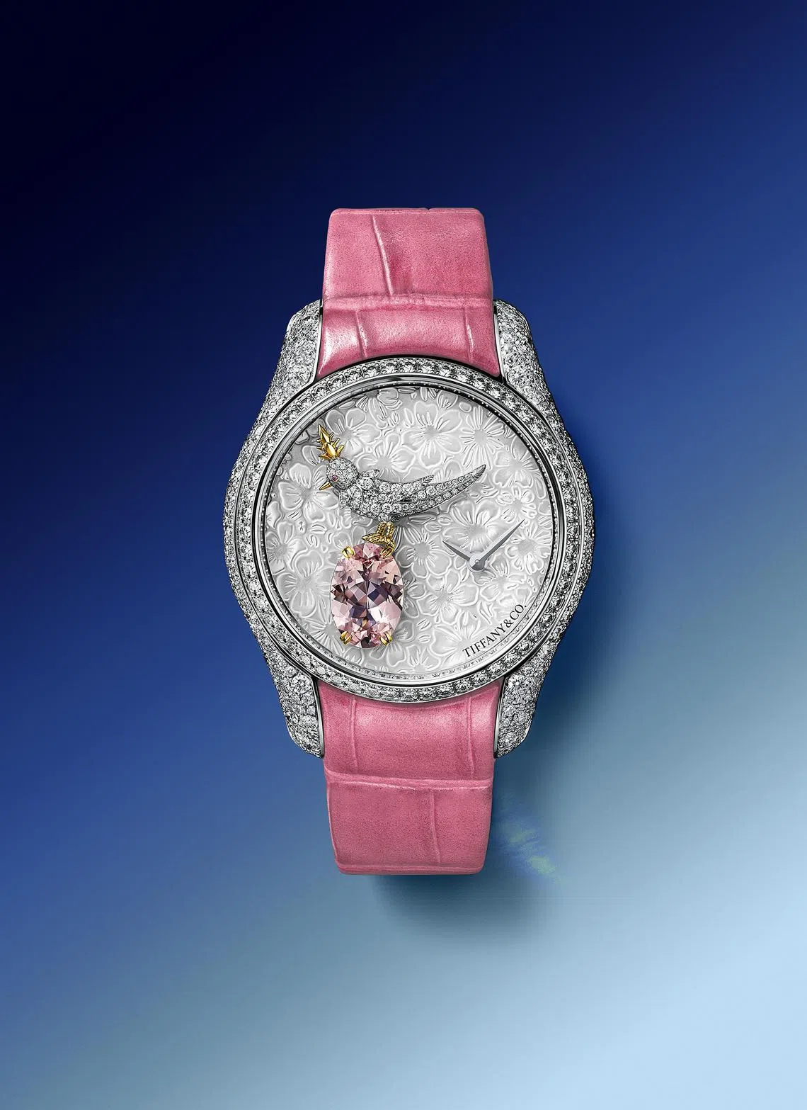 There are three models, each with 587 diamonds totalling 3.6 carats: oval morganite (1.45 carats), cushion-cut tanzanite (2.72 carats) or emerald-cut aquamarine (2.1 carats). Requiring 24 hours to craft, each bird is set with 119 diamonds and a pink sapphire eye.