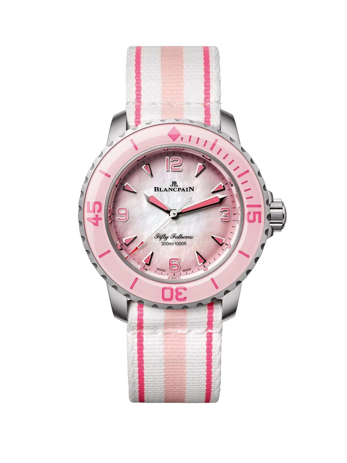 The pink edition is paired with a white fabric strap featuring two-tone pink stripes, or a sleek titanium bracelet. The edgier black version comes in black Tropic rubber, sailcloth or Nato fabric straps.