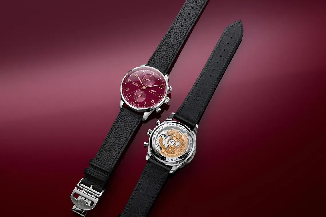 This special-release Portugieser Chronograph – limited to 1,000 pieces – has a 41mm stainless-steel case with a striking burgundy dial complemented by gold-plated hands and appliques..
