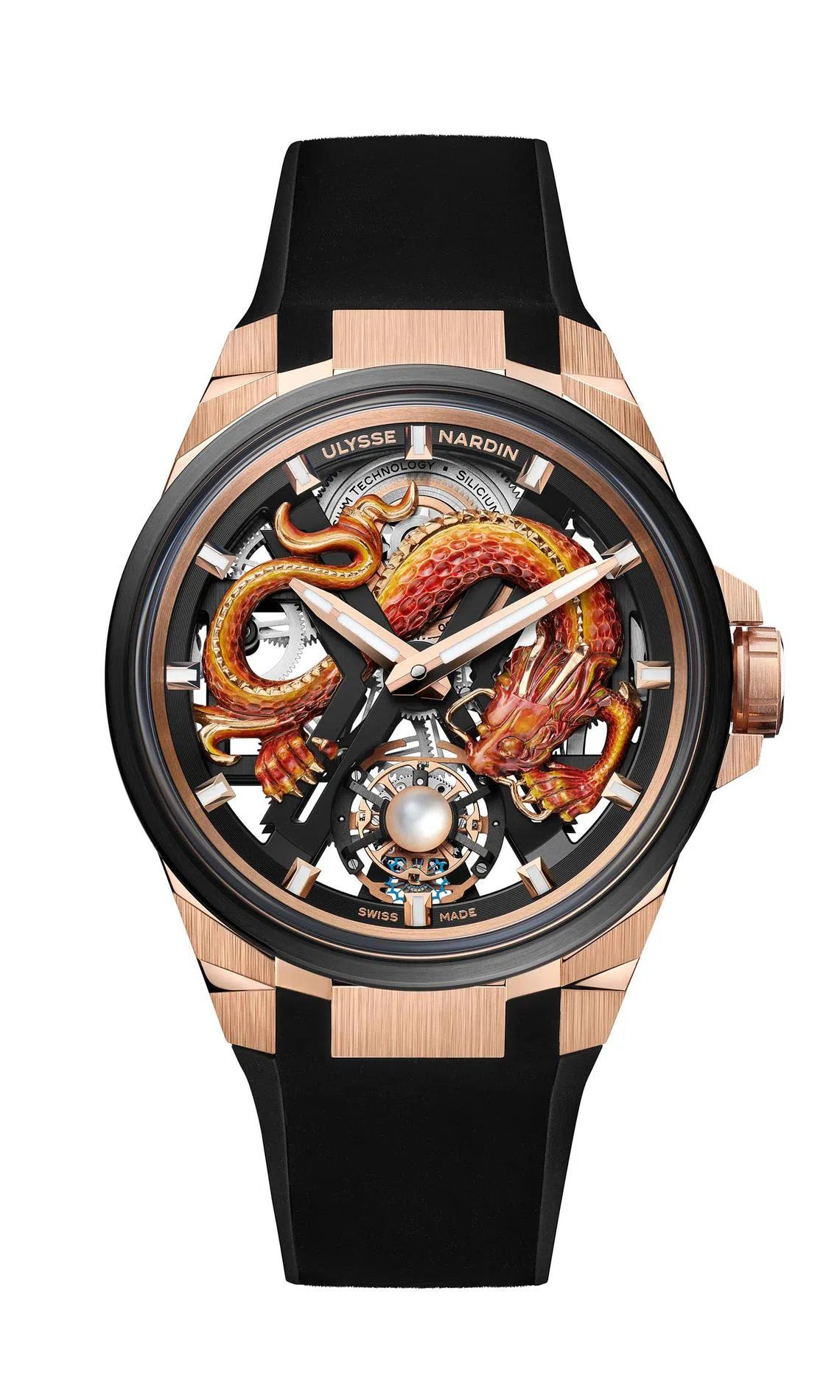The skeletal movement of Ulysse Nardin Blast Tourbillon Dragon is leveraged to magnificent effect with a hand-sculpted 5N rose-gold dragon coiled around the iconic X structure.