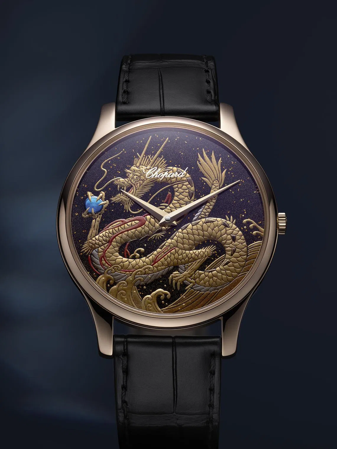 The Chopard L.U.C XP Urushi Year of the Dragon has an exquisite dial featuring a dragon motif, meticulously handcrafted in Japan using the traditional Maki-e technique.