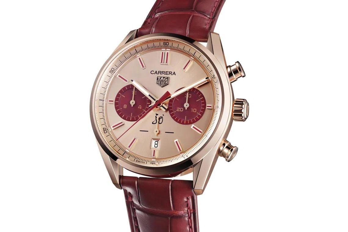 The Tag Heuer Carrera Chronograph features sunray-brushed dials adorned with rhodium-plated and pink gold-plated indexes.