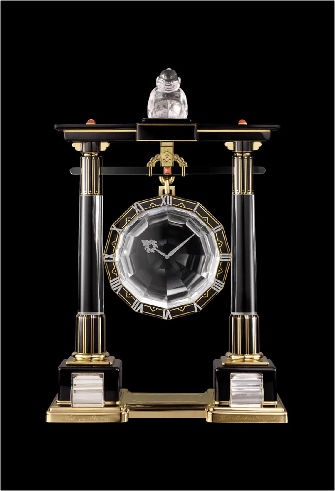 A 1923 large Portique mystery clock fashioned from gold, platinum, rock crystal, diamonds and galalith cabochons.