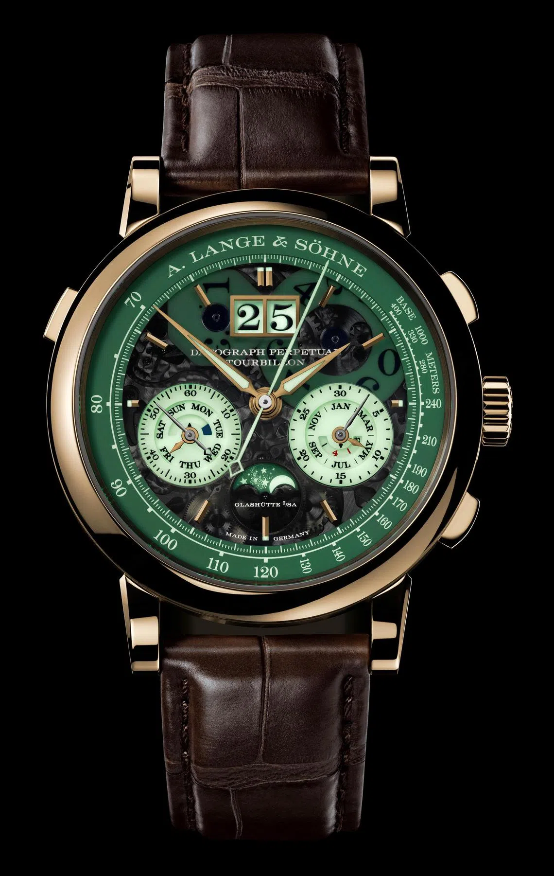 The A. Lange & Sohne Datograph Perpetual Tourbillon Honeygold Lumen features a smoked sapphire crystal dial with luminous elements on its sub-dials, and big date and moonphase displays.