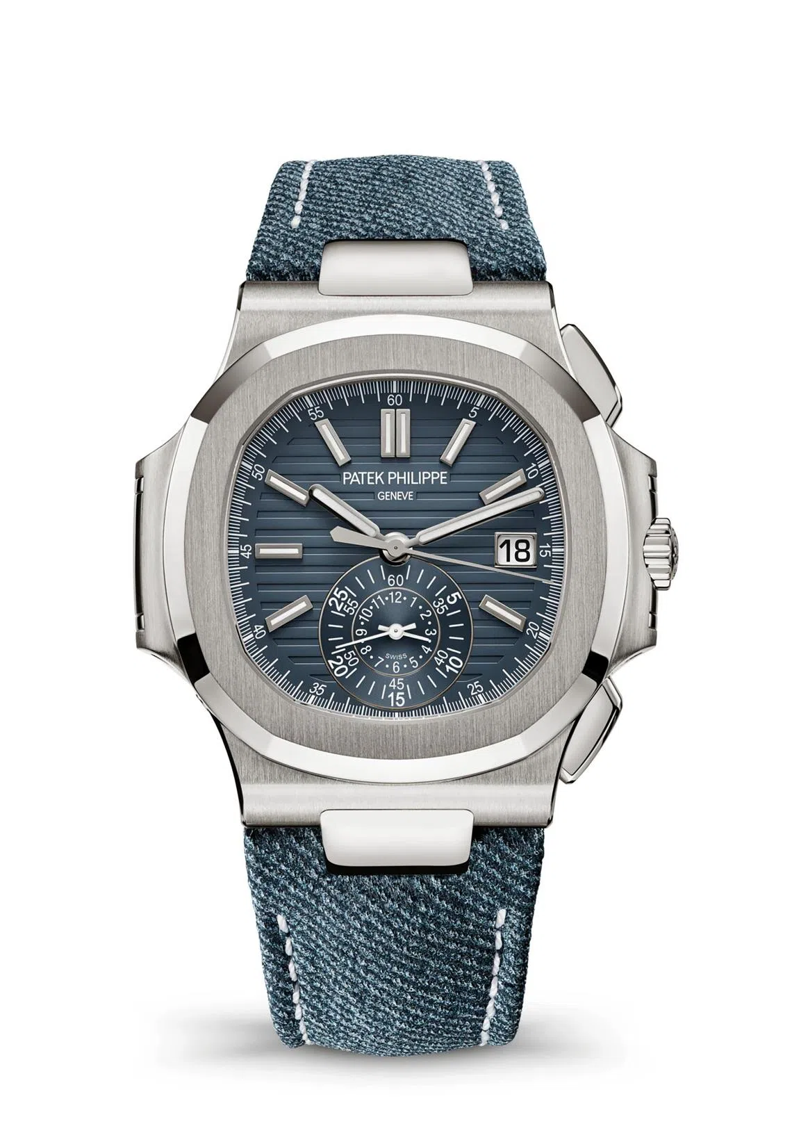 It sports the chamfered bezel, porthole-inspired case side flanges and integrated lugs familiar to Nautilus enthusiasts, but has chronograph pushers at two and four o’clock. The 40.5mm watch also rocks an unexpectedly stylish calfskin strap with denim motif.